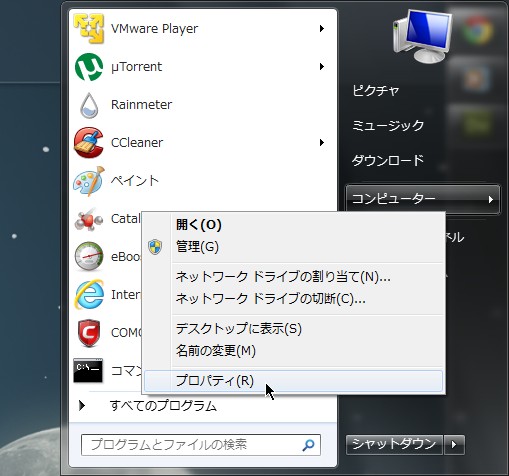 1.スタート>コンピューターを右クリックしてプロパティを開く