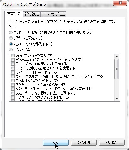パフォーマンスを優先するにチェックをいれてOKボタンをクリックします。
